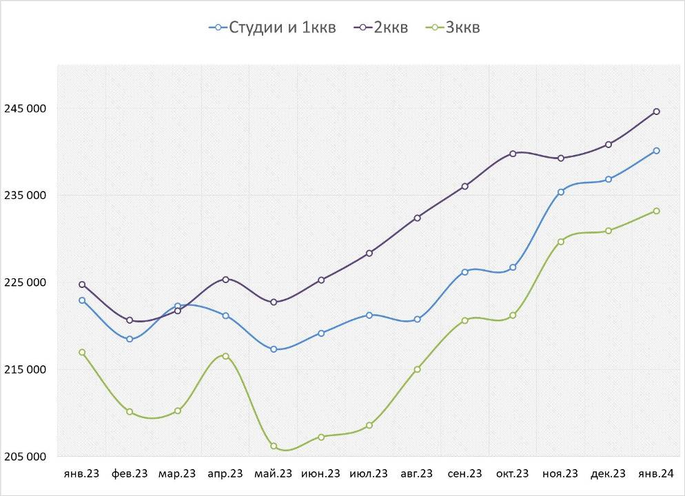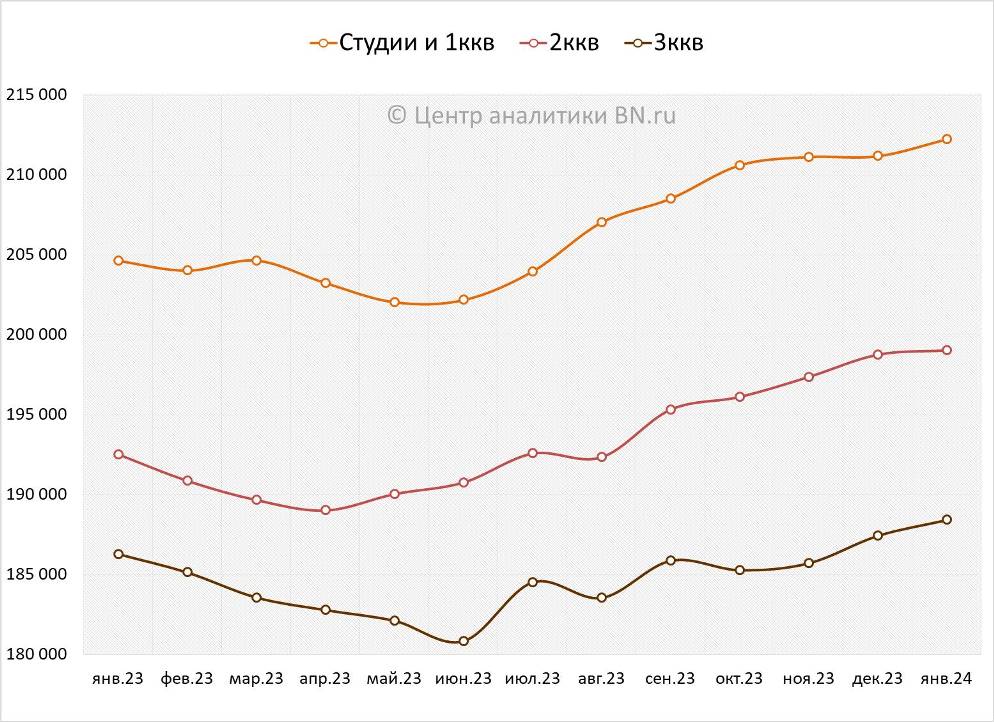 По данным Центра аналитики BN.ru, средняя цена предложения на первичном рынке Санкт-Петербурга в январе увеличилась на 1,05% (это 2 491 руб. с кв. м). К началу февраля 2024 года она выросла до 240,3 тыс. руб. за кв. м. В расчет не брались новостройки премиум- и элит-класса.