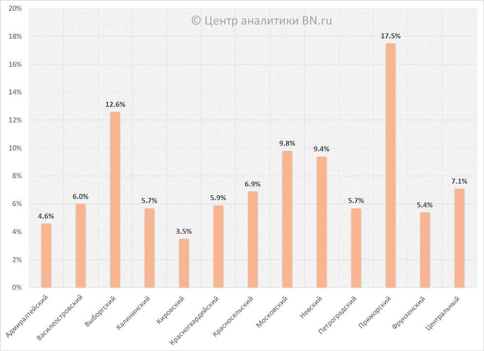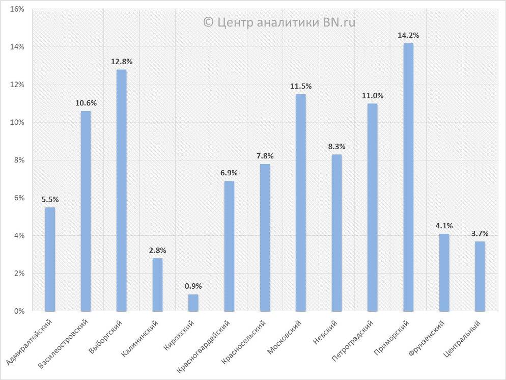 В структуре предложения по районам лидирующую позицию занимает Приморский район Петербурга – 14,2% от всего объема рынка новостроек. Далее на рынке квартир в строящихся домах значительные доли занимают Василеостровский, Выборгский, Московский и Петроградский районы, предложение в них составляет 10,6%, 12,8%, 11,5% и 11,0% от всего объема рынка новостроек. Минимальное количество строительных объектов зафиксировано в Калининском, Кировском, Фрунзенском и Центральном районах – 2,8%, 0,9%, 4,1% и 3,7% соответственно.