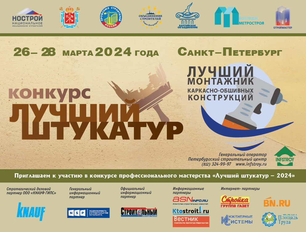 Национальное объединение строителей совместно с профсоюзной организацией и при поддержке Правительства Санкт-Петербурга с 26 по 28 марта 2024 года проведут конкурс специалистов на звание «Лучший мастер отделочных строительных работ» в номинациях: «Лучший по профессии монтажник каркасно-обшивных конструкций», «Лучший учащийся по специальности монтажник каркасно-обшивных конструкций», «Лучший по профессии штукатур», «Лучший учащийся по специальности штукатур». Это окружной этап Национального конкурса профессионального мастерства «СТРОЙМАСТЕР-2024». В нем примет участие более 30 мастеров из городских строительных компаний и студентов профессиональных образовательных учреждений. Монтажникам каркасно-обшивных конструкций и штукатурам предстоит выполнить практическое задание на специально подготовленной площадке. Оценивать работу конкурсантов будет компетентное жюри, в которое вошли преподаватели колледжей и лицеев города, представители строительных организаций и учебного центра «КНАУФ Северо-Запад».