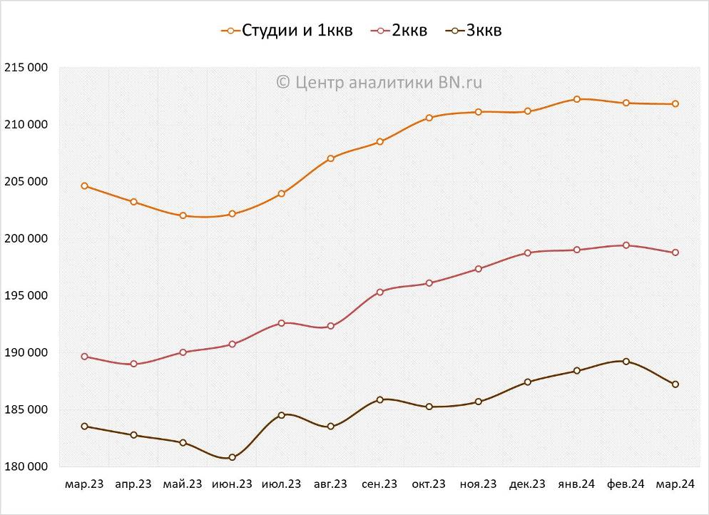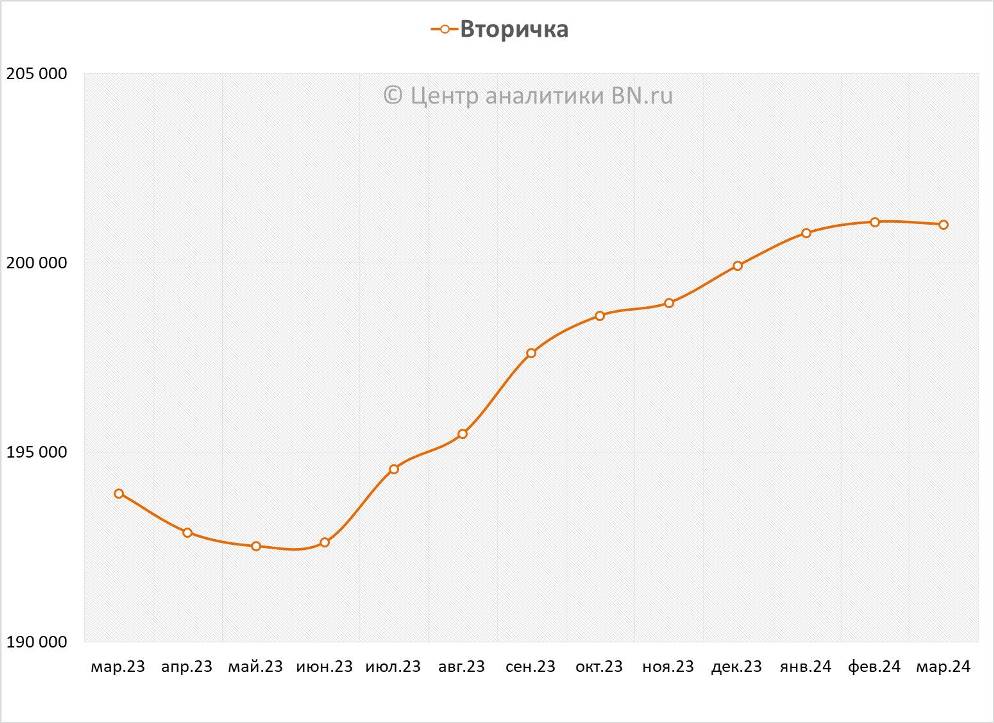 По подсчетам Центра аналитики BN.ru, средняя цена предложения на вторичном рынке типового жилья Санкт-Петербурга в марте изменилась на пренебрежимо малые -0,03% (это -66 руб. за кв. м). К началу апреля 2024-го она составила 201 тыс. руб. за кв. м.