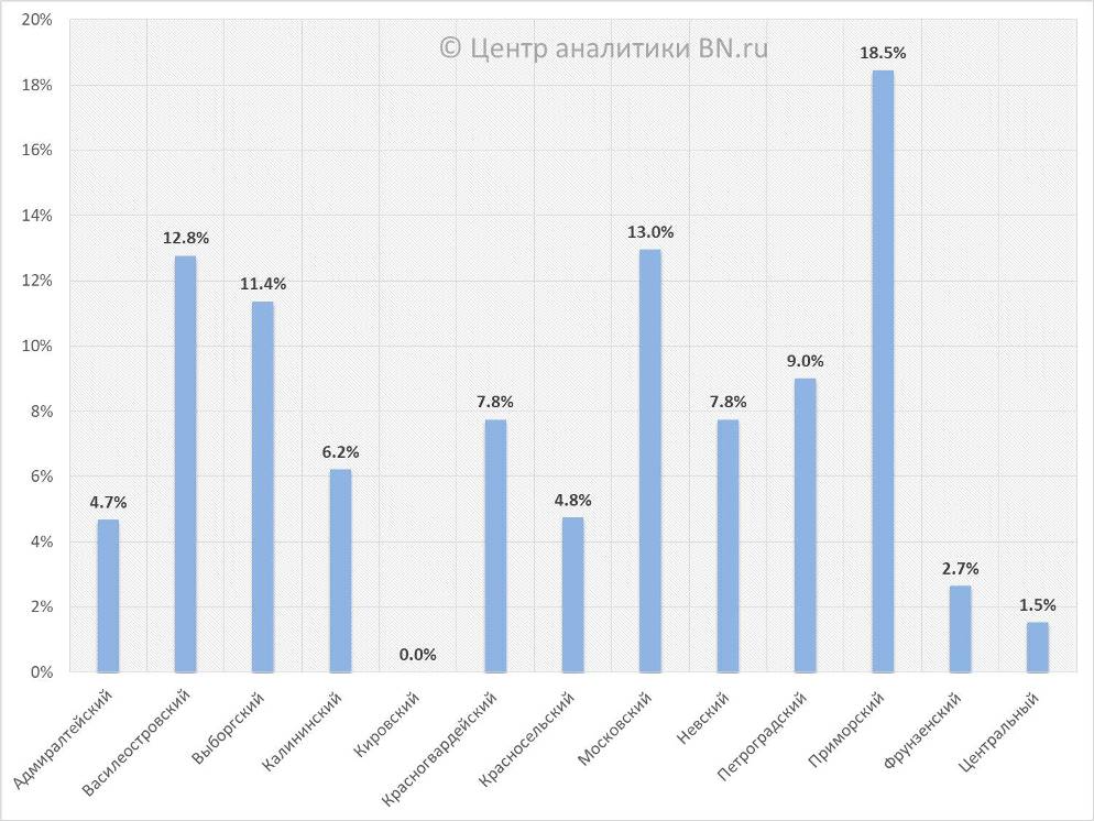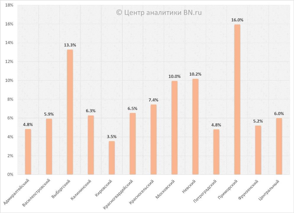 В структуре предложения по традиционным городским районам (без учета пригородных) лидирующую позицию всё еще занимает Приморский район Петербурга – 18,5% от всего объема рынка новостроек. Далее на рынке квартир в строящихся домах значительные доли предложения приходятся на Василеостровский, Выборгский, Московский и Петроградский районы, предложение в них составляет 12,8%, 11,4%, 13,0% и 9,0% от всего объема рынка новостроек. Минимальное количество строительных объектов зафиксировано в Кировском, Фрунзенском и Центральном районах – 0,0%, 2,7% и 1,5% соответственно.