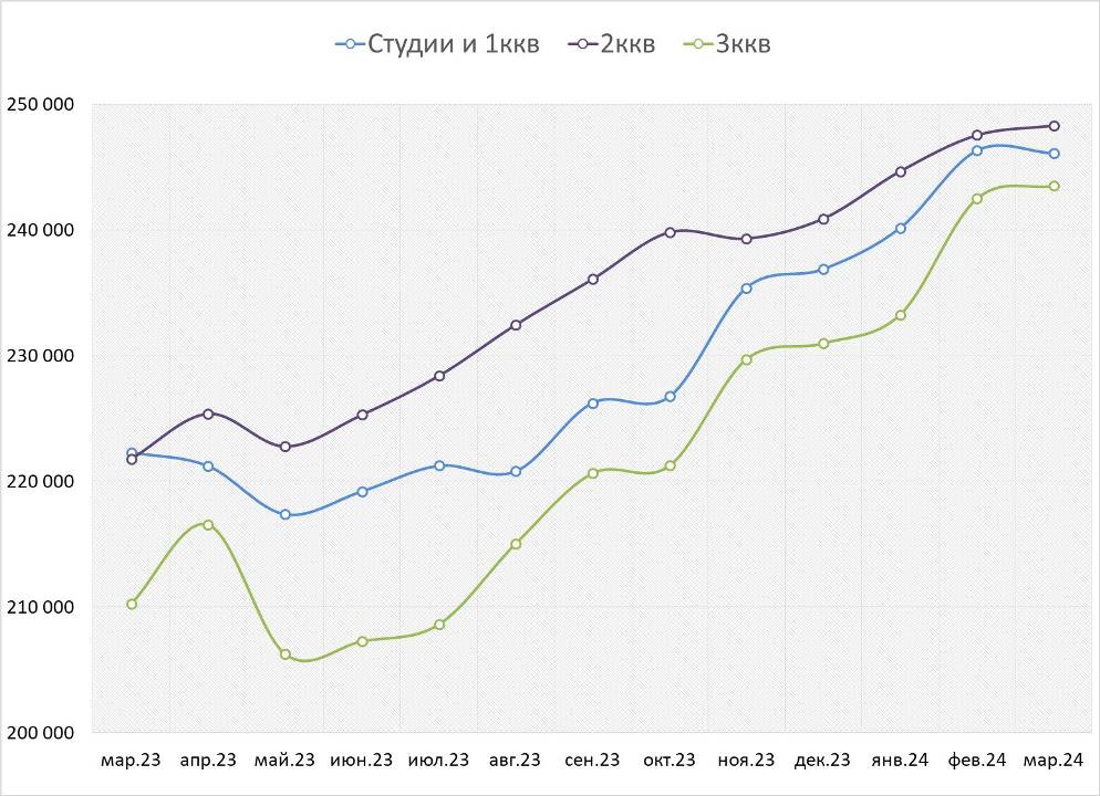 Средние цены составили: для студий и однокомнатных квартир – 8,4 млн руб., двухкомнатных – 15,9 млн руб., трехкомнатных – 21,8 млн руб.