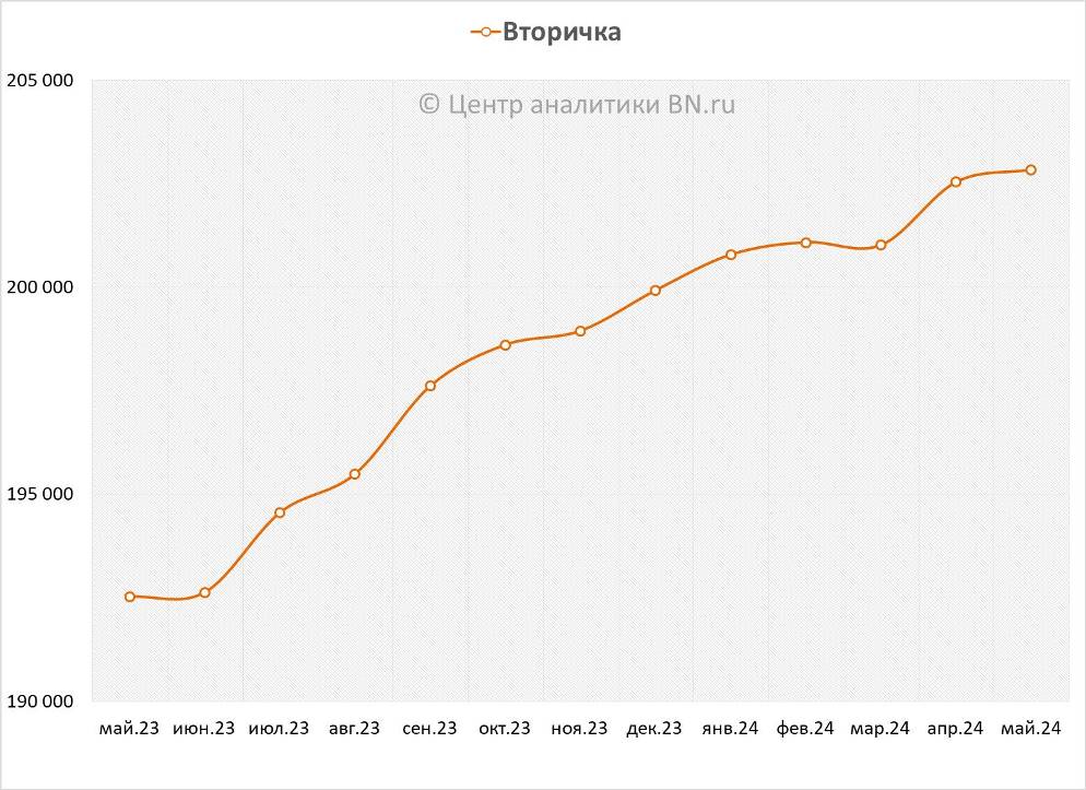 По подсчетам Центра аналитики BN.ru, изменение средней цены предложения на вторичном рынке жилья класса масс-маркет в рублевом эквиваленте составило 0,15% (это 296 руб. за кв. м). К концу мая 2024-го средняя цена достигла 202,8 тыс. руб. за кв. м.