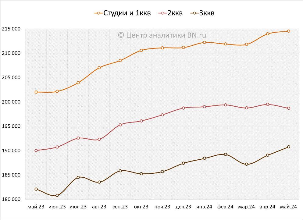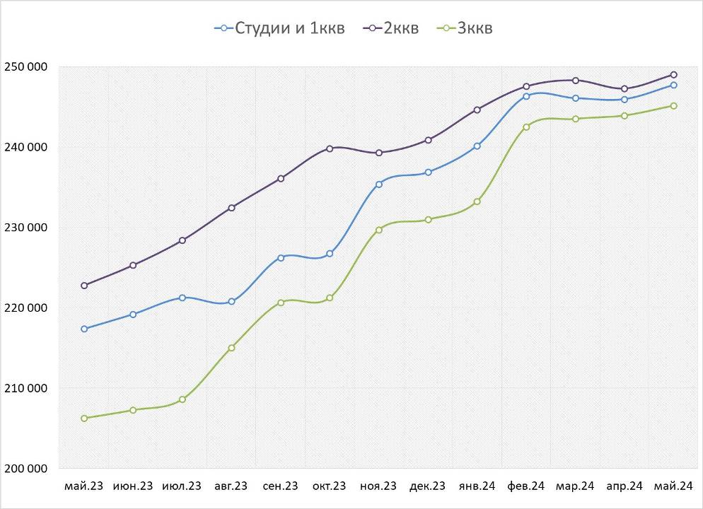 По данным Центра аналитики BN.ru, средняя цена предложения на рынке строящегося жилья Санкт-Петербурга в мае выросла на символические 0,7% (это 1 711 руб. с кв. м) и к началу июня 2024-го составила 247,8 тыс. руб. за кв. м. Традиционно в расчет не принимались премиальные новостройки.