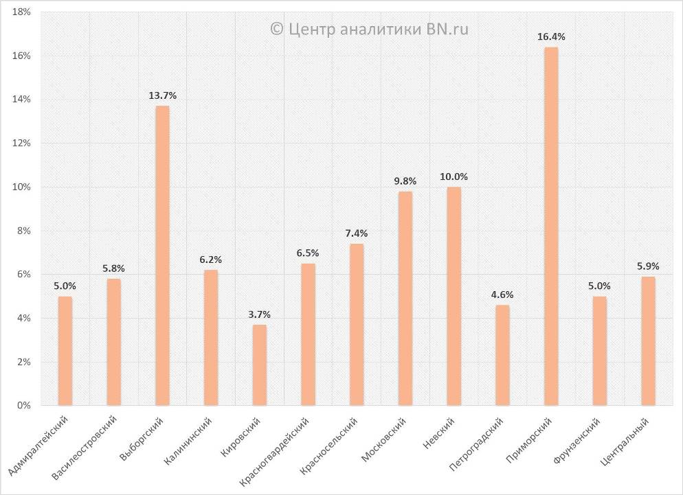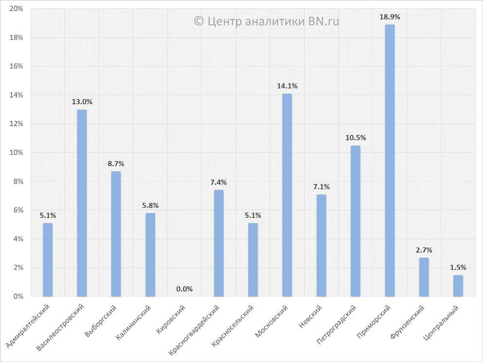 В структуре предложения по традиционным городским районам (без учета пригородных) по-прежнему лидирует Приморский район Петербурга, но из-за хороших темпов продаж его доля снизилась до 18,9% от всего объема рынка новостроек. Далее на рынке квартир в строящихся домах значительные доли предложения приходятся на Василеостровский, Московский и Петроградский районы, предложение в них составляет 13%, 14,1%, и 10,5% от всего объема рынка новостроек. Минимальное количество строительных объектов зафиксировано в Кировском, Фрунзенском и Центральном районах – 0%, 2,7% и 1,5% соответственно.