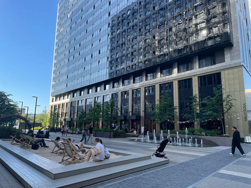 Благоустройство внутренней территории впечатляет! Фонтаны и арт-объекты, световые панели и дизайнерские фонари. Много мест для отдыха: можно посидеть одному, а можно и в компании. Вот женщина что-то увлеченно читает, расположившись на скамье. Две девушки за столиком в кафе делятся новостями и потягивают коктейли. А группа мужчин собралась у парапета рядом с газоном и что-то оживленно обсуждает. Подумалось, что люди, которые снимают здесь апартаменты на «долгосрок», наверное, уже успели создать «группы по интересам», а может, даже подружиться. Это здорово!