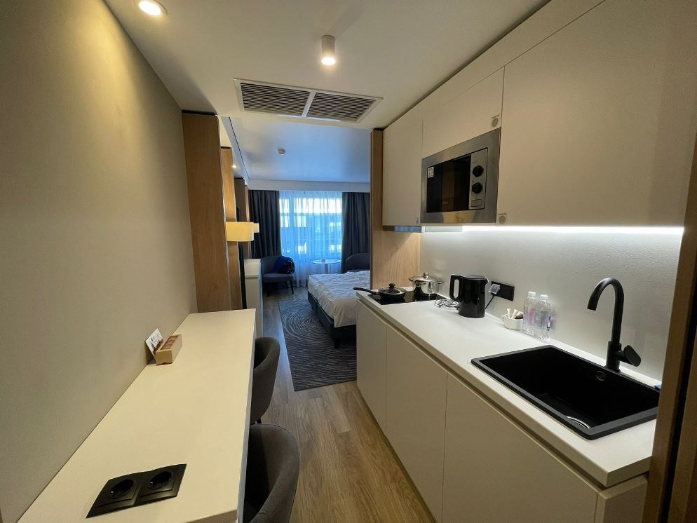 Изучаю кухонную зону. Тоже всё предельно чисто. Белые шкафчики. Компактный холодильник с морозильной камерой. И даже – вот уж сюрприз – небольшая стиральная машинка! В сушилке для посуды – тарелки, чашки, стаканы, поварешки. На индукционной варочной поверхности – кастрюля и сковородка, рядом электрочайник… Но что-то не видно приборов. Как же я «столоваться» буду? Вспоминаю и про обещанные отелем халаты-тапочки. Почему я их тоже не наблюдаю? Решаю спросить всё у горничных.