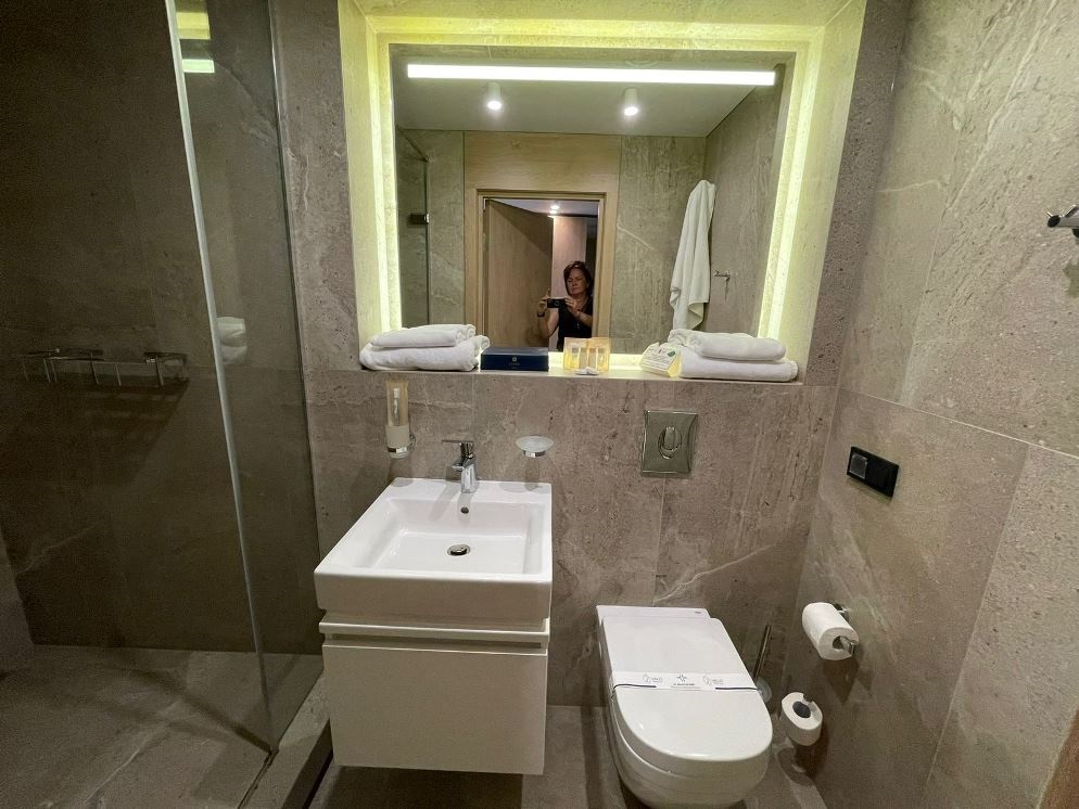 Тем временем осматриваюсь дальше. В номере чисто, запах свежий, температура комфортная – работает кондиционер. Захожу в санузел. Сверкающая плитка под мрамор. Большая душевая кабинка с двумя лейками, на полке – необходимые «мыльно-рыльные» аксессуары, включая зубные щетки с пастой. Огромное зеркало с подсветкой делает помещение шире. Без труда нахожу полотенца, туалетную бумагу и салфетки, в тумбочке обнаруживаю фен.