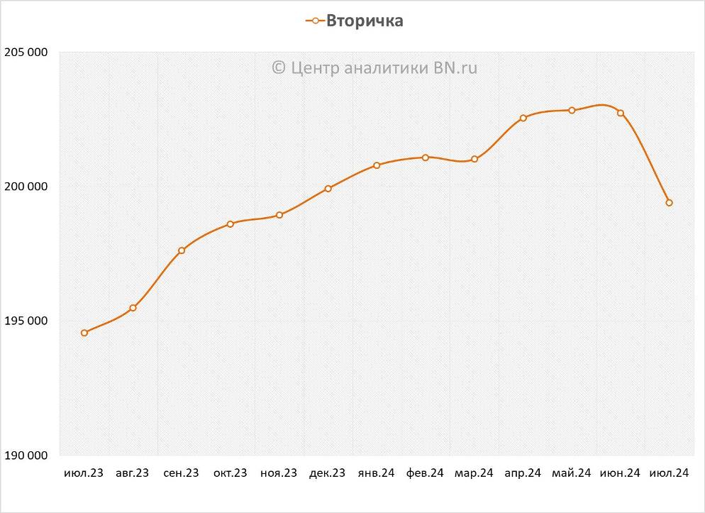 По подсчетам Центра аналитики BN.ru, изменение средней цены предложения на вторичном рынке массового жилья в рублевом эквиваленте составило -1,64% (это заметные 3 335 руб. за кв. м). К концу второго летнего месяца 2024 года средняя цена составила 199,4 тыс. руб. за кв. м, вернувшись к уровню цен декабря прошлого года.