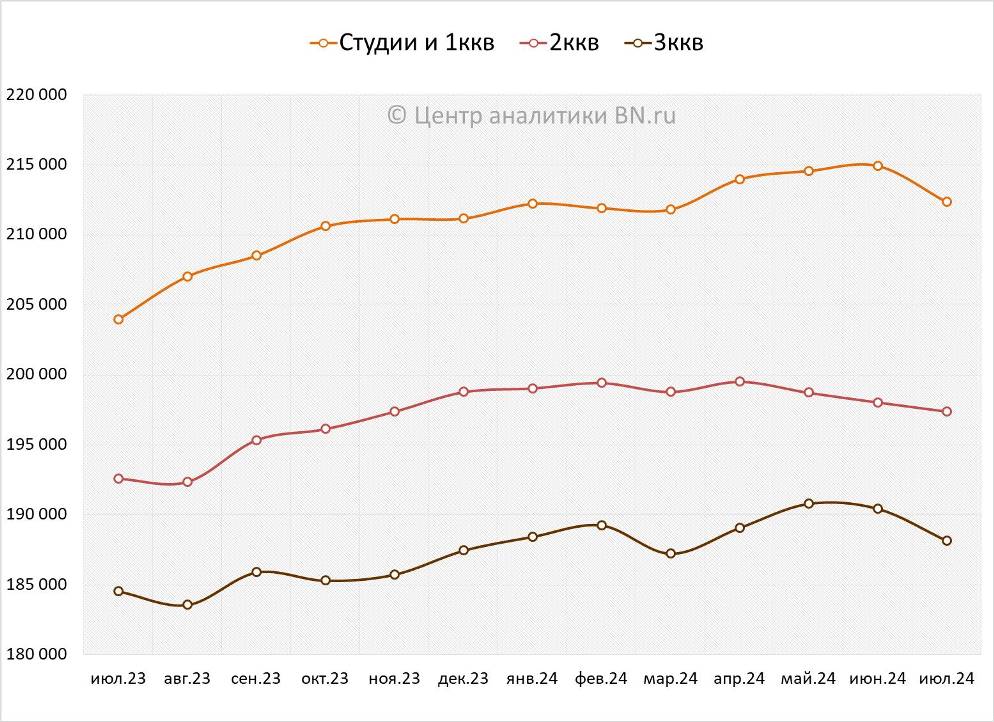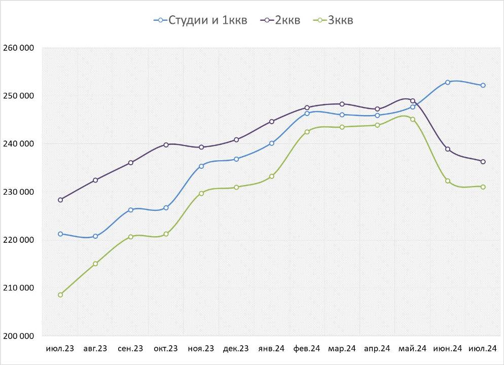 Средние цены предложения студий и однокомнатных квартир на конец месяца составили 7,1 млн руб., двухкомнатных – 11,4 млн руб., трехкомнатных – 15,2 млн руб.