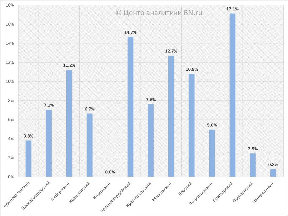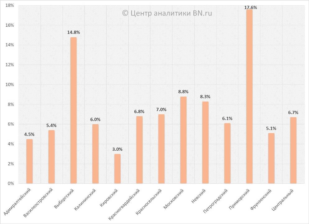 В структуре предложения по традиционным городским районам (без учета пригородных) всё еще лидирует Приморский район Петербурга – 17,1% от всего объема рынка новостроек. Далее на рынке квартир в строящихся домах существенные доли занимают Выборгский, Красногвардейский, Московский и Невский районы, предложение в них составляет 11,2%, 14,7%, 12,7% и 10,8% от всего объема рынка новостроек. Минимальное количество квартир в продаже зафиксировано в Кировском, Фрунзенском и Центральном районах – 0%, 2,5% и 0,8% соответственно.