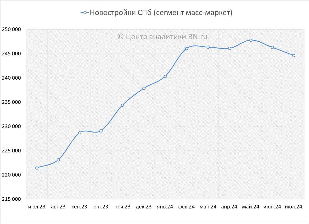 По данным Центра аналитики BN.ru, средняя цена предложения на рынке строящегося жилья Санкт-Петербурга в июле снизилась на 0,68% (это 1 667 руб. с кв. м) и к началу последнего летнего месяца 2024-го составила 244,6 тыс. руб. за кв. м. Как всегда, в расчет принимались только новостройки сегмента масс-маркет.