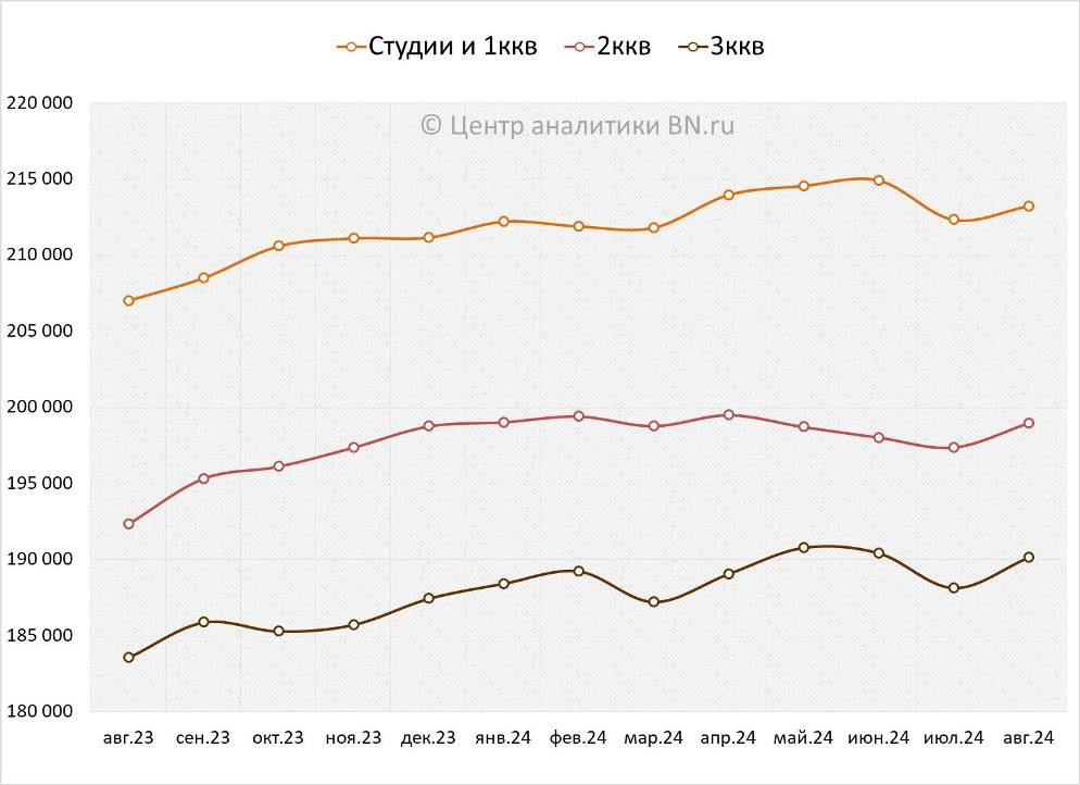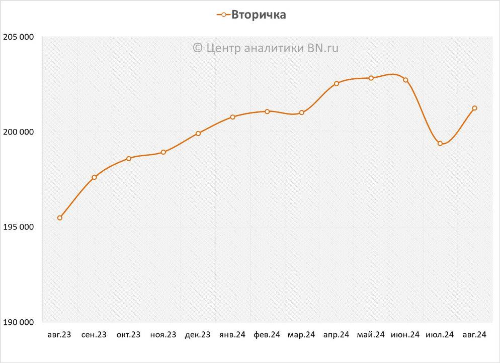 По подсчетам Центра аналитики BN.ru, изменение средней цены предложения на вторичном рынке массового жилья в рублевом эквиваленте составило 0,93% (это 1 852 руб. за кв. м), и к началу осени 2024 она составила 201,3 тыс. руб. за кв. м. Примерно столько же просили за готовые квартиры в начале весны нынешнего года.