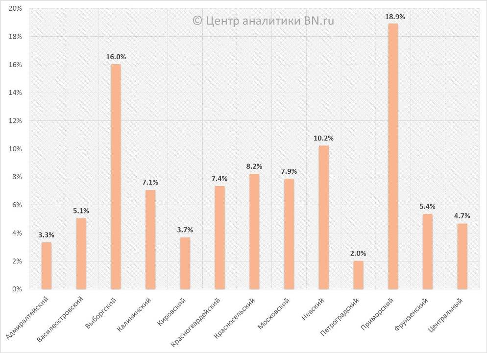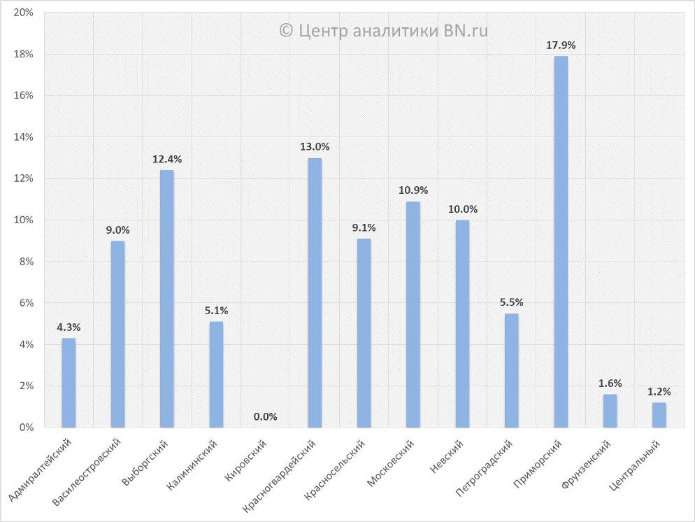 В структуре предложения по традиционным городским районам (без учета пригородных) традиционно лидирует Приморский район Петербурга – 17,9% от всего объема рынка новостроек. Далее на рынке квартир в строящихся домах большие доли занимают Выборгский, Красногвардейский, Московский и Невский районы, предложение в них составляет 12,4%, 13,0%, 10,9% и 10,0% от всего объема рынка новостроек. Минимальное количество квартир в продаже зафиксировано в Кировском, Фрунзенском и Центральном районах – 0,0%, 1,6% и 1,2% соответственно.