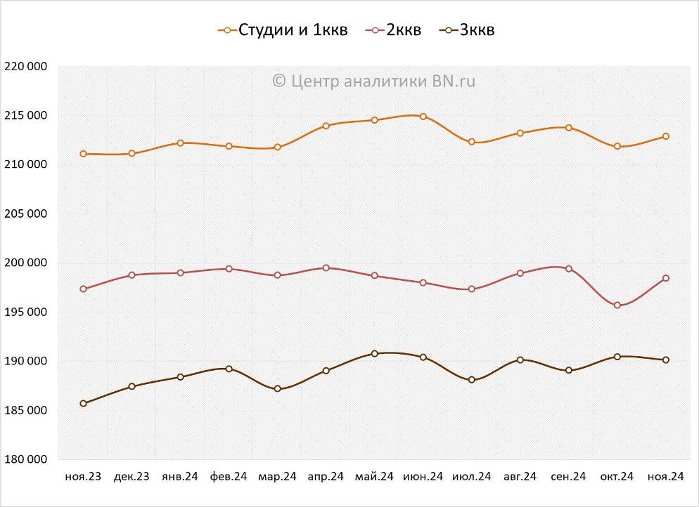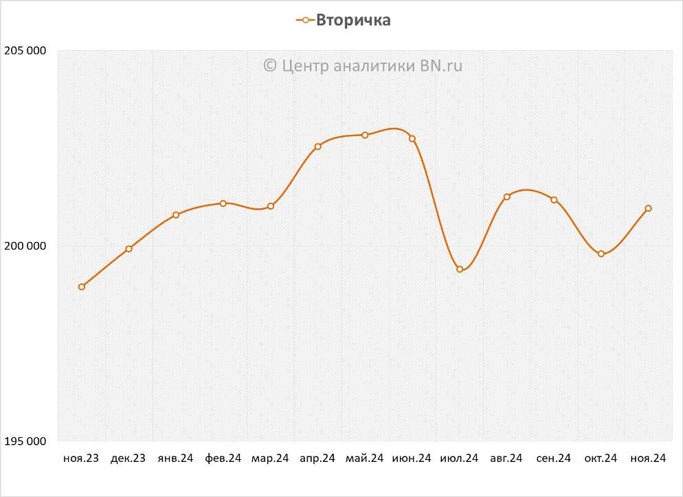 По подсчетам Центра аналитики BN.ru, изменение средней цены предложения на вторичном рынке массового жилья в рублевом эквиваленте составило 0,6%, увеличившись на 1 165 руб. с кв. м. Показатель средней цены предложения в ноябре 2024 года – 201,0 тыс. руб. за кв. м.