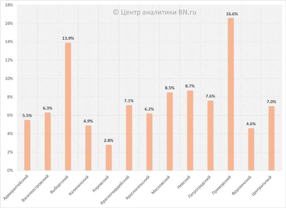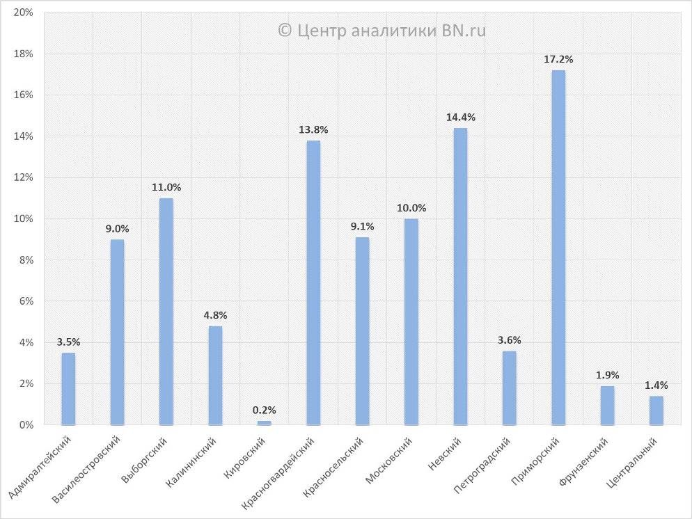 В структуре предложения по традиционным городским районам (без учета пригородных) лидирующую позицию по-прежнему занимает Приморский район Петербурга – 17,2% от всего объема рынка новостроек. Далее на рынке квартир в строящихся домах большие доли занимают Выборгский, Красногвардейский, Московский и Невский районы, предложение в них составляет 11,0%, 13,8%, 10,0% и 14,4% от всего объема рынка новостроек. Минимальное количество квартир в продаже зафиксировано в Кировском, Фрунзенском и Центральном районах – 0,2%, 1,9% и 1,4% соответственно.