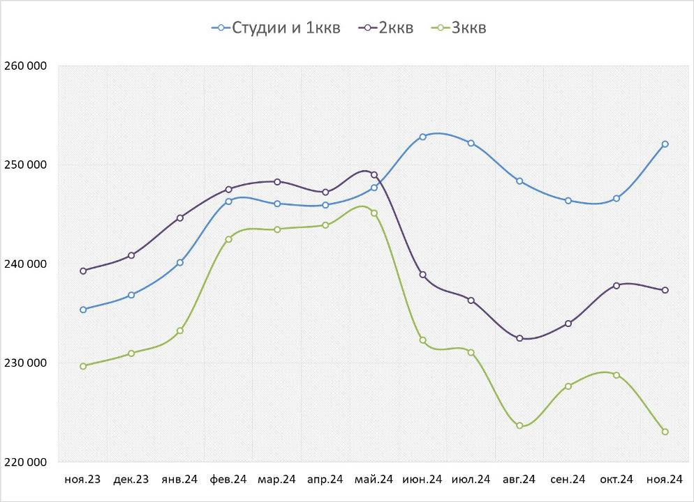 | Тип квартиры | Цена | Октябрь 2024 | Ноябрь 2024 | Изменение за месяц |