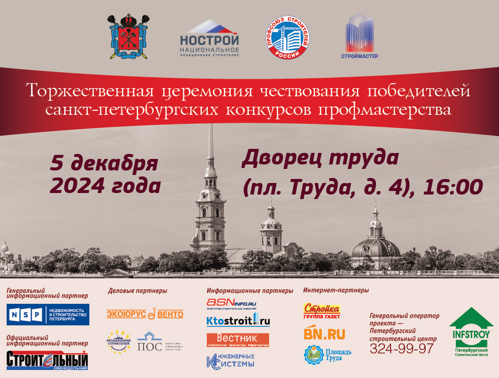 Они определены компетентным жюри в рамках Национального конкурса «СТРОЙМАСТЕР» и профессиональных соревнований, проводимых в г. Санкт-Петербурге в следующих номинациях: «Лучшая бригада», «Лучший по профессии», «Лучшая строительная площадка», «Лучший бытовой городок», «Лучшая саморегулируемая организация по работе с рабочими кадрами», «Лучшая трудовая династия», «Ветеран строительной отрасли Санкт-Петербурга», «Лучший руководитель строительной компании, внесший личный вклад в повышение престижа рабочей профессии», «Лучшее учебное заведение по подготовке рабочих», «Лучшее СМИ, освещающее вопросы профобразования», «Лучшая социально ответственная компания». Всего будет награждено около 80 человек.