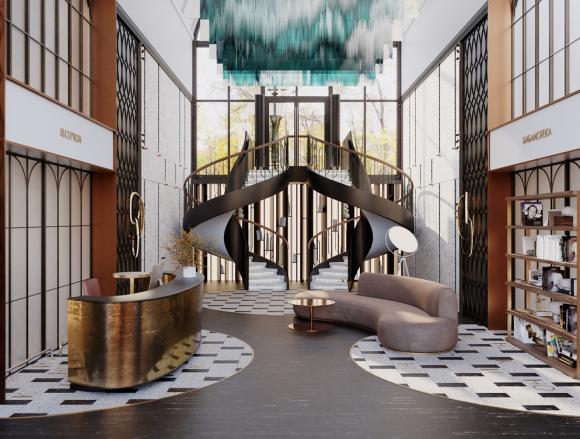 Архитектура выполнена в стиле ар-деко с отделкой натуральным камнем. Общественные зоны имеют авторский дизайн. В парадном лобби с семиметровым потолком, создающим ощущение элитного отеля, располагается консьерж-служба, готовая прийти на помощь 24/7.