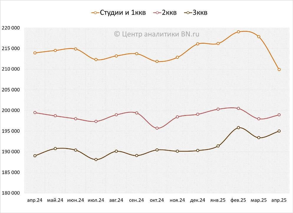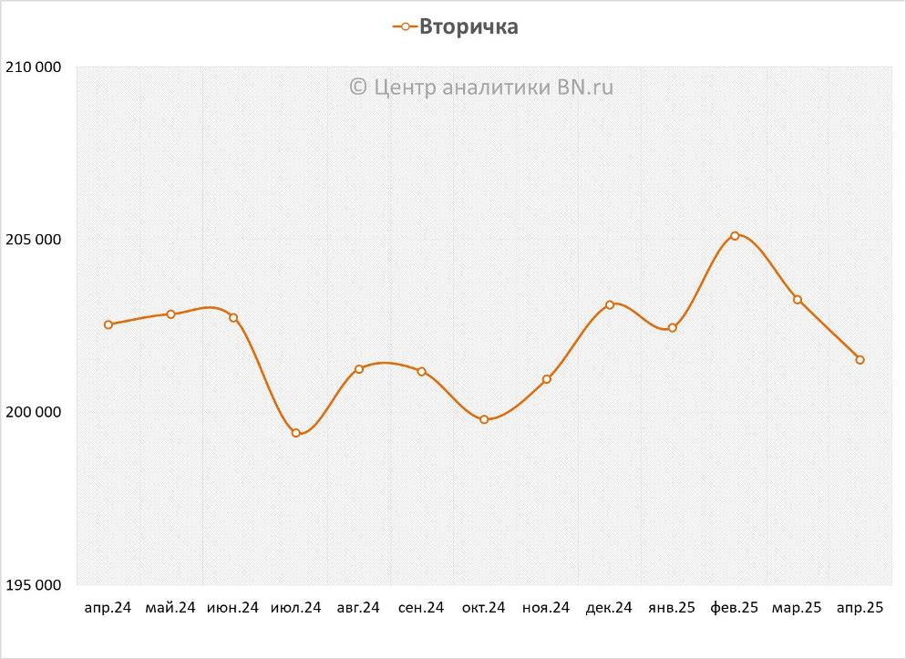 По подсчетам Центра аналитики BN.ru, изменение средней цены предложения на рынке готового жилья массового сегмента в рублевом эквиваленте составило -0,9%, уменьшившись на 1 740 руб. с кв. м. Показатель средней цены предложения в апреле 2025 года – 201,5 тыс. руб. за кв. м.