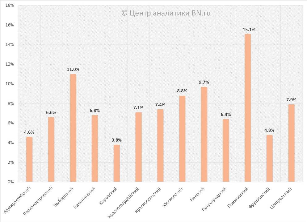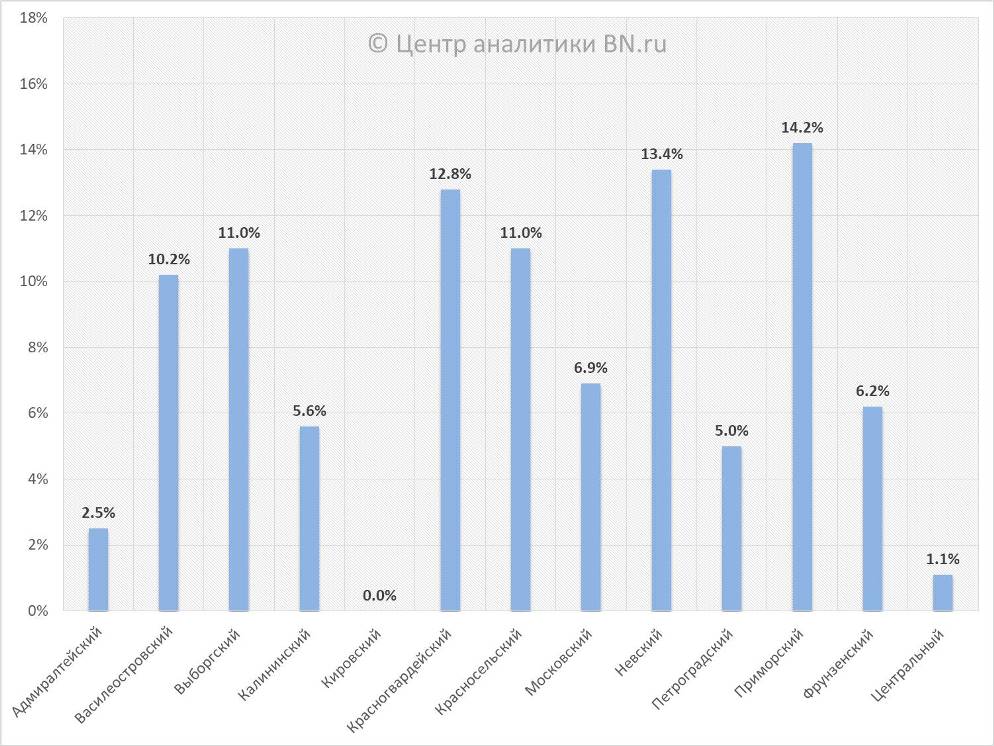В структуре предложения по городским районам без учета пригородных на конец месяца лидирующую позицию занимает Приморский район – 15,1% от объема выставленных на продажу квартир. Далее на вторичном рынке жилья значительные доли занимают Выборгский, Московский, Невский и Центральный районы, предложение в них составляет 11,0%, 8,8%, 9,7% и 7,9% соответственно. Минимальные доли составляет предложение в Адмиралтейском, Кировском и Фрунзенском районах – 4,6%, 3,8% и 4,8% соответственно от общего объема выставленных на продажу квартир.