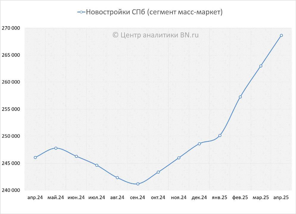 По данным Центра аналитики BN.ru, средняя цена предложения на рынке строящегося жилья Санкт-Петербурга в апреле увеличилась на 2,15% (это 5 652 руб. с кв. м). И к концу второго весеннего месяца составила 268,7 тыс. руб. за кв. м. Как обычно, в расчет принимались только новостройки сегмента масс-маркет.