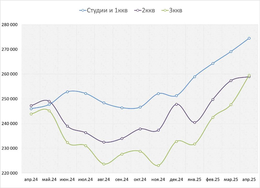 Цены предложения студий и однокомнатных квартир за месяц уменьшились на 3,7%, двухкомнатные подорожали на 0,5%. Трехкомнатные квартиры выросли в цене на 0,8%.