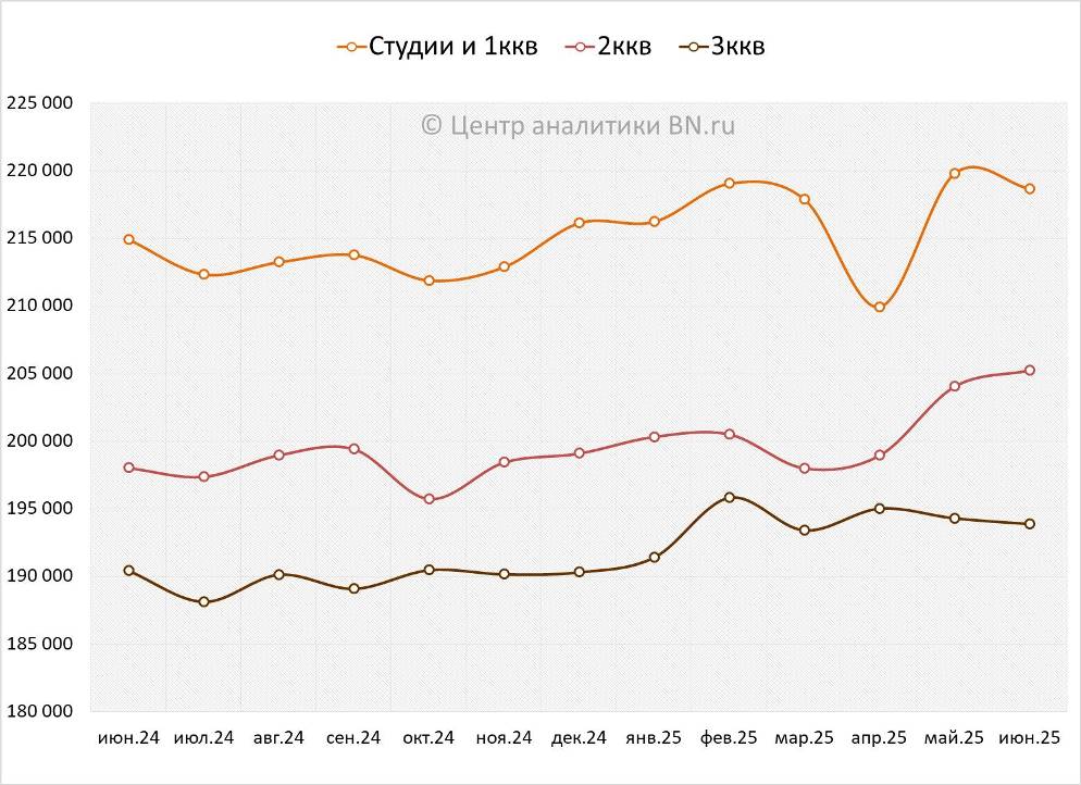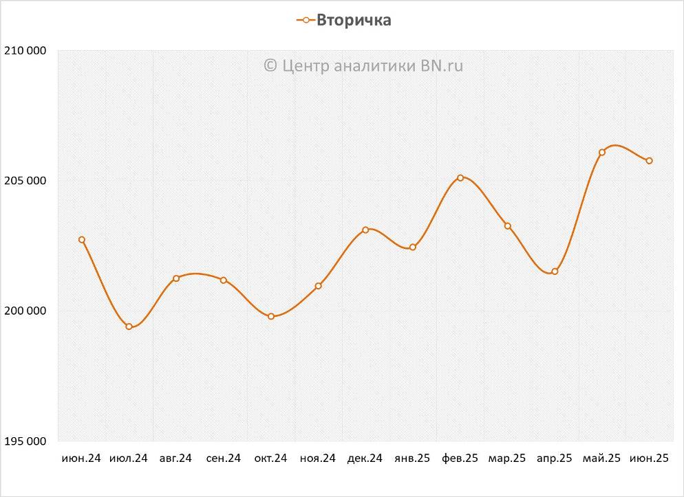 По подсчетам Центра аналитики BN.ru, изменение средней цены предложения на рынке готового жилья массового сегмента в рублевом эквиваленте составило совершенно незначительные -0,16%, снизившись на 324 руб. с кв. м. Показатель средней цены предложения в июне 2025 года – 205,8 тыс. руб. за кв. м.
