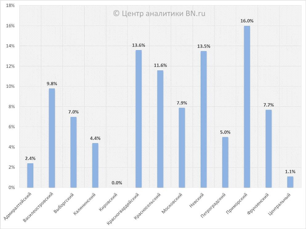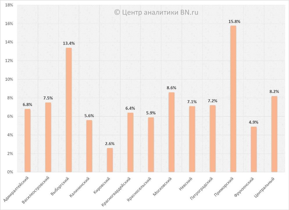 В структуре предложения по городским районам без учета пригородных на конец месяца лидирующую позицию по-прежнему занимает Приморский район – 15,8% от объема выставленных на продажу квартир. Далее на вторичном рынке жилья значительные доли занимают Выборгский, Московский и Центральный районы, предложение в них составляет 13,4%, 8,6% и 8,2% соответственно. Минимальные доли составляет предложение в Кировском и Фрунзенском районах – 2,6% и 4,9% соответственно от общего объема выставленных на продажу квартир.