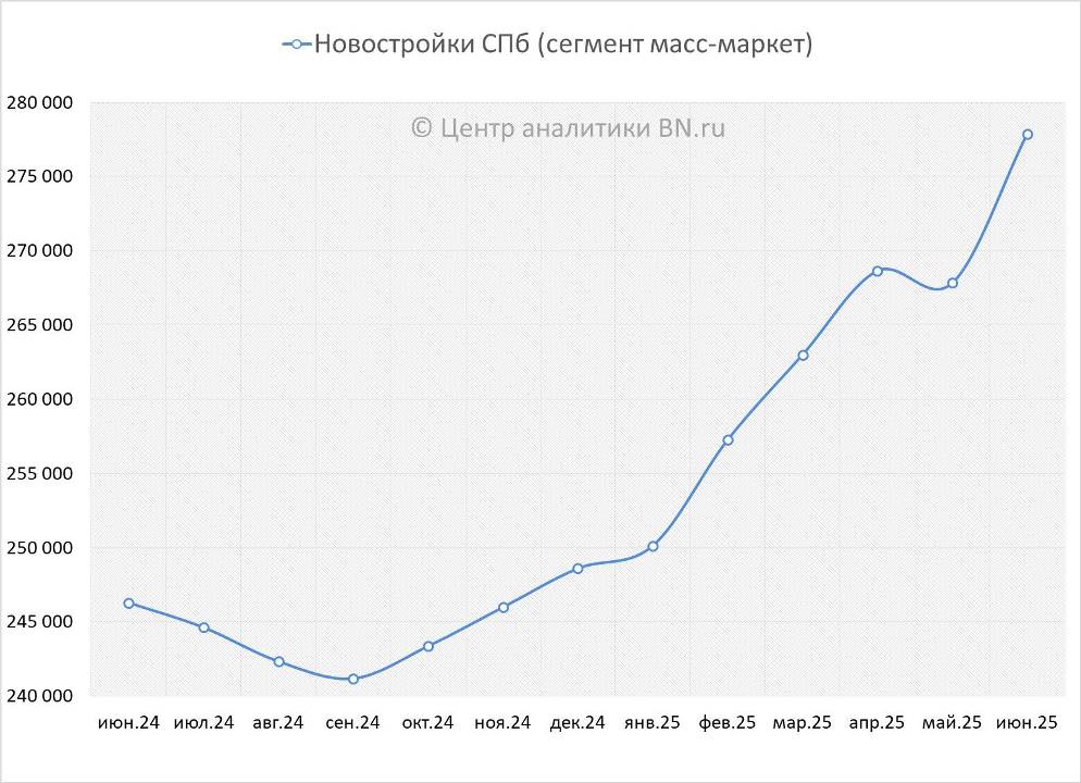 По данным Центра аналитики BN.ru, средняя цена предложения на рынке строящегося жилья Санкт-Петербурга в первом летнем месяце выросла на внушительные 3,75% (это 10 041 руб. с кв. м) и к началу июля составила 277,9 тыс. руб. за кв. м. По традиции в расчет принимались только новостройки сегмента масс-маркет.