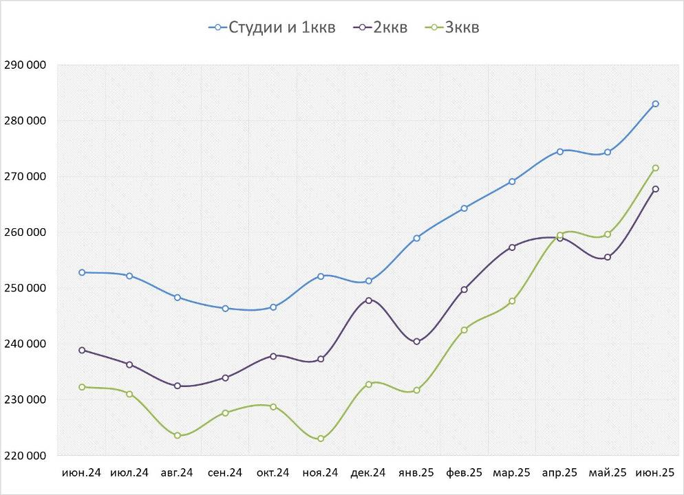 | Тип квартиры | Цена | Май 2025 | Июнь 2025 | Изменение за месяц |