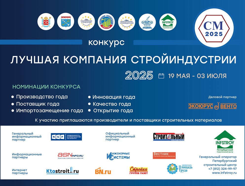 Конкурс «Лучшая компания стройиндустрии-2025» организуется НП «Объединение производителей стройматериалов» при поддержке Правительства Санкт-Петербурга и Администрации Ленинградской области, профсоюза строителей города и области. Оператор проекта – ООО «Петербургский строительный центр».