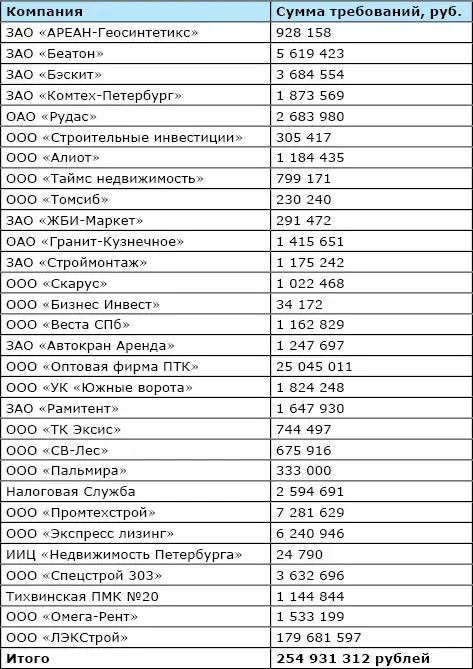 Общая сумма дебиторской задолженности на сегодняшний день составляет 131 млн рублей, часть долга по решению петербургских и московских судов различных инстанций переведена на ООО «Холдинговая компания "Ассоциация по сносу зданий"».