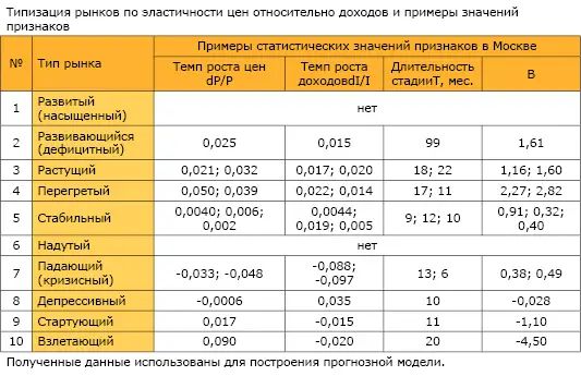 В цит. работе /6/ на основе изучения эластичности цен на жилье по доходам населения получены оценки среднемесячных темпов роста цен на жилье в Москве и доходов населения на протяжении 12 стадий длительностью от 6 до 22 месяцев. Под стадией динамики рынка понимается отрезок времени, в течение которого темпы роста цен существенно не менялись. По соотношению темпов роста цен и доходов сформировано 10 типов рынков, отличающихся эластичностью цен по доходам.