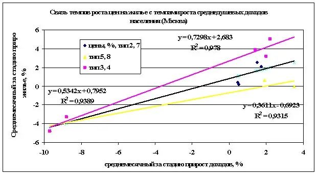 Модель для прогнозирования цен на жилье получена в виде статистической связи между темпами роста цен на жилье на каждой стадии динамики и темпов роста среднедушевых доходов населения (рис. 1).