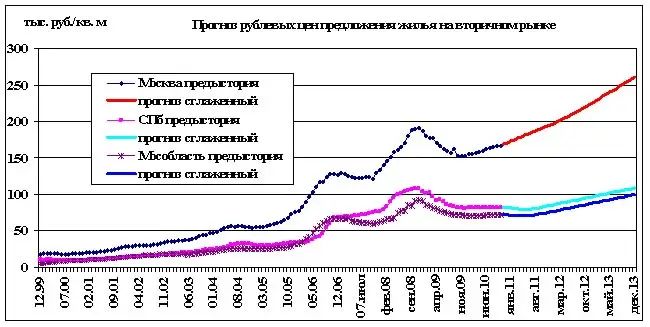 На основании этих данных рассчитан среднесрочный прогноз цен на жилье для Москвы, Санкт-Петербурга и Московской области. При этом введены допущения: