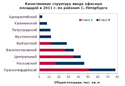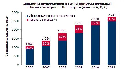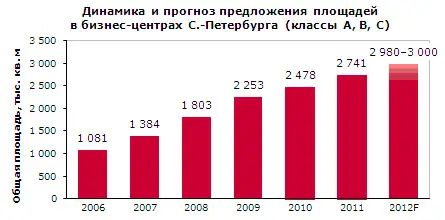 В два кризисных года строители сдавали почти по 300 тыс. кв. м офисной недвижимости. В 2011 году объем нового строительства составил порядка 180 тыс. кв. м, отмечает руководитель отдела исследований Jones Lang LaSalle в Санкт-Петербурге Вероника Лежнева. Однако в следующем году, при условии своевременной реализации всех заявленных проектов, объем сданных площадей будет еще больше. На 2012-2013 годы запланировано ввести в эксплуатацию 250 тыс. кв. м офисных площадей.