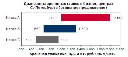 В среднем на конец 2011 года ставки аренды (с учетом НДС и коммунальных услуг) по Санкт-Петербургу в действующих бизнес-центрах таковы: класс А – 1000–2000 руб./кв. м в месяц; класс В – 650–1300 руб./кв. м в месяц; класс С – 500–950 руб./кв. м в месяц.