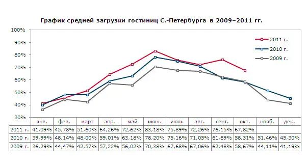 По данным Комитета по инвестициям и стратегическим проектам Петербурга (КИСП) в 2011 году был сдано в эксплуатацию 1161 гостиничных номеров. На конец года в городе работал 651 отель или 29 242 номера – такие данные приводит руководитель КИСП Алексей Чичканов.