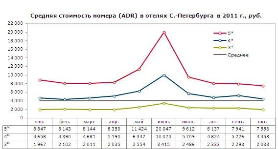 По данным руководителя отдела аналитических исследований «АРИН» Оксаны Малеевой, наиболее высокая стоимость размещения в отелях Петербурга может колебаться от 9,8 тыс. до 16,8 тыс. руб. в сутки за стандартный двухместный номер в зависимости от сезона. Самая низкая стоимость размещения в Петербурге – в хостелах от 0,3 тыс. до 1,4 тыс. руб. в сутки за одно место.