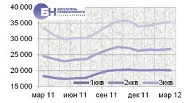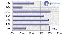 Структура предложения на рынке аренды типового жилья по диапазону цены в марте 2012 года выглядит следующим образом. Максимальное количество предложений комнат находится в ценовом диапазоне от 10 тыс. до 11 тыс. руб. в месяц, что занимает 32,8% от всего предложения. Наибольший объем однокомнатных квартир зафиксирован в диапазоне от 20 тыс. до 22 тыс. руб., от 18 тыс. до 20 тыс. руб. и от 16 тыс. до 18 тыс. руб. в месяц, что составляет 23,2%, 22,6% и 19% от всего объема по указанному типу квартир. В сегменте двухкомнатных квартир максимальное предложение объектов приходится на диапазоны от 20 тыс. до 23 тыс. руб. и от 23 тыс. до 26 тыс. руб. в месяц, что занимает 26,9% и 25,3% от всего объема. По трехкомнатным квартирам максимальное число предложений объектов находится в диапазоне цены от 22 до 27 тыс. руб., от 27 тыс. до 32 тыс. руб. в месяц, что составляет 25,4% и 19,8% от всего объема по данному типу квартир. |