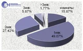 | В структуре предложения на рынке посуточной аренды типового жилья преобладают однокомнатные квартиры, они занимают 49,1% рынка. Двухкомнатные квартиры составляют 27,4%, доля трехкомнатных квартир 5,9% от общего объема типового жилья. Комнаты в общей структуре составляют 15,8% от всего предложения. | |