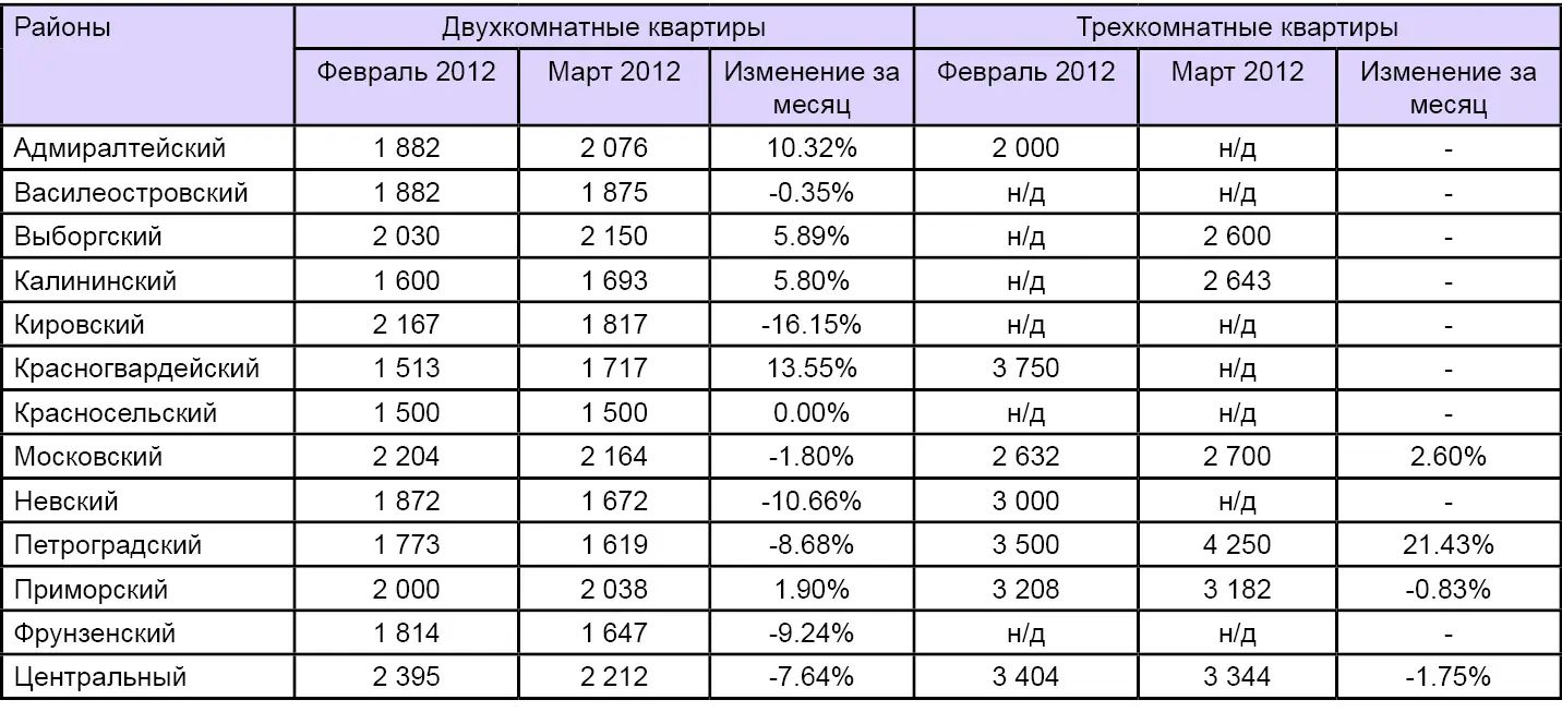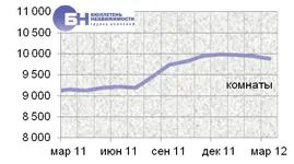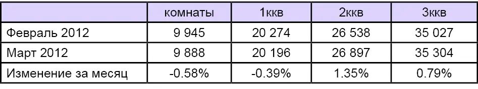 Стоимость аренды трехкомнатных квартир в Петербурге на конец месяца составила 35,3 тыс. руб. в месяц, что на 0,8% больше февраля 2012 года. Средняя цена предложения комнат показала спад на 0,6%, стоимость аренды в месяц составила 9,9 тыс. руб.