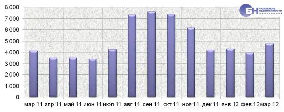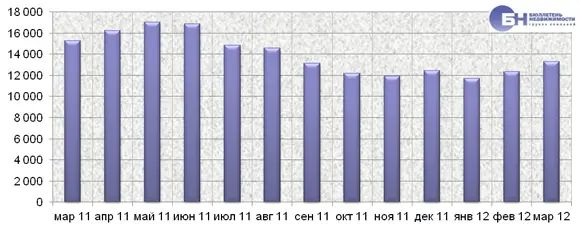 | Объем предложения (количество заявок на сдам) на конец месяца составил 13,3 тысячи объектов (из них 8,9 тысяч квартир и 4,4 тысяч комнат). В целом это на 8,1% выше показателя в феврале 2012 года. Максимальный объем предложения за прошедший год зафиксирован в мае 2011 года и составил 17 тысяч объектов на рынке аренды типового жилья. | |