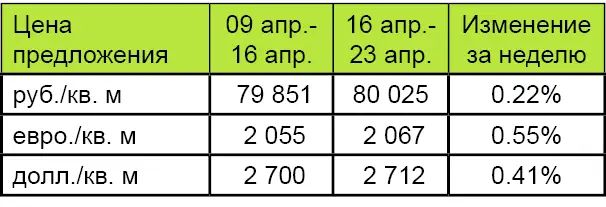 За минувшую неделю процент изменения средней цены предложения на вторичном рынке квартир в рублевом эквиваленте составил 0,09%, это 85,7 руб. с одного квадратного метра. Показатель средней цены предложения за неделю со 16 апреля по 23 апреля 2012 года составил 92,5 тыс. руб./кв. м. Цена предложения в долларах составила 3,1 тыс. за кв. м, в евро 2,4 тыс.