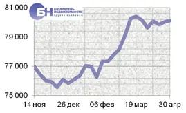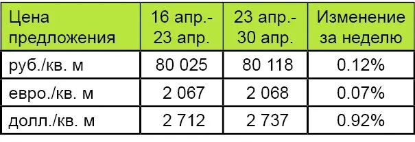 За минувшую неделю процент изменения средней цены предложения на вторичном рынке квартир в рублевом эквиваленте составил 0,14%, это 103,4 руб. с одного квадратного метра. Показатель средней цены предложения за неделю со 23 апреля по 30 апреля 2012 года составил 92,7 тыс. руб./кв. м. Цена предложения в долларах составила 3,2 тыс. за кв. м, в евро 2,4 тыс.