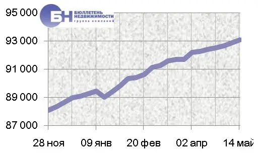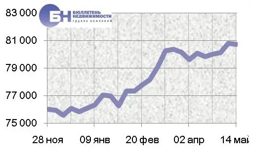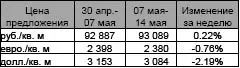 За минувшую неделю процент изменения средней цены предложения на вторичном рынке квартир в рублевом эквиваленте составил 0,22%, это 202,4 руб. с одного квадратного метра. Показатель средней цены предложения за неделю с 07 мая по 14 мая 2012 года составил 93,1 тыс. руб./кв. м. Цена предложения в долларах составила 3,1 тыс. за кв. м, в евро 2,4 тыс.