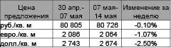 За минувшую неделю процент изменения средней цены предложения на рынке новостроек в рублевом эквиваленте составил минус 0,1%, это 79,2 руб. с одного квадратного метра. Показатель средней цены предложения за неделю с 7 мая по 14 мая 2012 года составил 80,7 тыс. руб./кв. м. Цена предложения в долларах составила 2,7 тыс. за квадратный метр, в евро – 2,1 тыс.