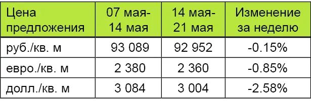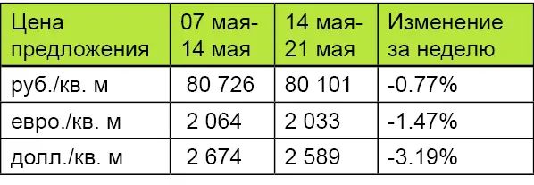За минувшую неделю процент изменения средней цены предложения на вторичном рынке квартир в рублевом эквиваленте составил минус 0,15%, это 136,8 руб. с одного квадратного метра. Показатель средней цены предложения за неделю с 14 мая по 21 мая 2012 года составил 93 тыс. руб./кв. м. Цена предложения в долларах составила 3 тыс. за кв. м, в евро 2,4 тыс.