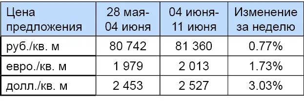 За минувшую неделю процент изменения средней цены предложения на рынке новостроек в рублевом эквиваленте составил 0,77%, это 617,9 руб. с одного квадратного метра. Показатель средней цены предложения за неделю с 04 июня по 11 июня 2012 года составил 81,4 тыс. руб./кв. м. Цена предложения в долларах составила 2,5 тыс. за квадратный метр, в евро – 2 тыс.